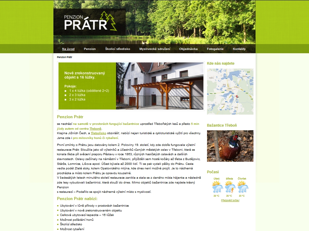 Majitelé penzionu Prátr u města Třeboně nás požádali, abychom přetvořili jejich stránky na stále více populární systém Wordpress. Což jsme také udělali, zachovali jsme původní grafický vzhled a stránky byly převedeny do HTML 5. Mimo jiné byla také zmodernizována galerie fotografií.