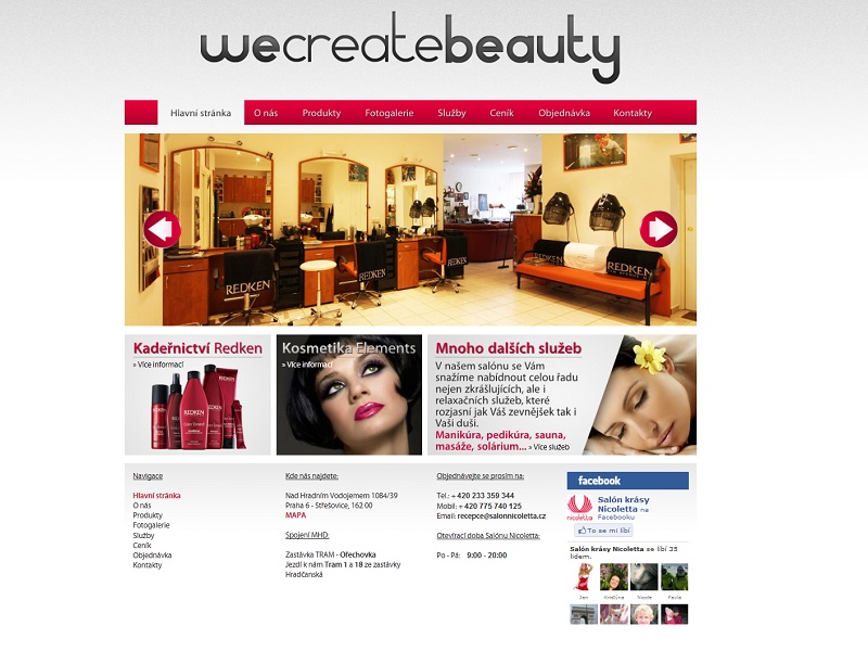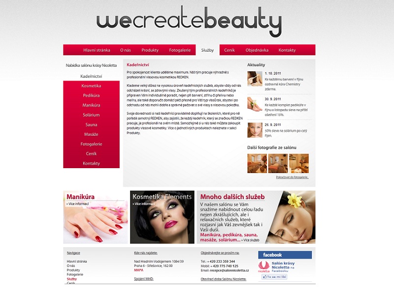 Toto je kosmetický salon Nicoleta, sídlící v Praze Střešovicích. Ačkoliv samotný salon existuje již přes deset let, webové stránky si od nás nechal zřídit až nyní. A co zde naleznete? Nabízejí zde profesionální služby v oblasti kadeřnictví, kosmetiky, masáží, pedikúry, manikúry a solária, a je také zde možné udělat si předem na libovolnou z těchto služeb rezervaci. Jejich stránky naleznete salonnicoletta.manikstudio.cz.