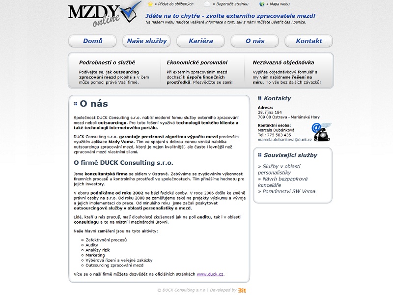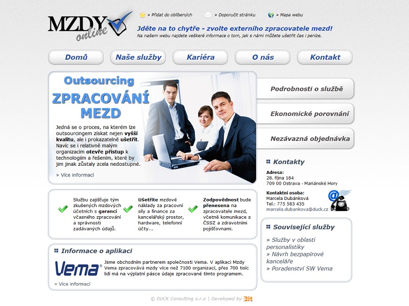 Společnost mzdy-online se zabývá outsourcingovým způsobem zpracování mezd, službami v oblasti personalistiky a nabízí poradenství se softwarem VEMA na účetnictví a personalistiku. Stránky společnosti mzdy-online naleznete na www.mzdyonline.cz.