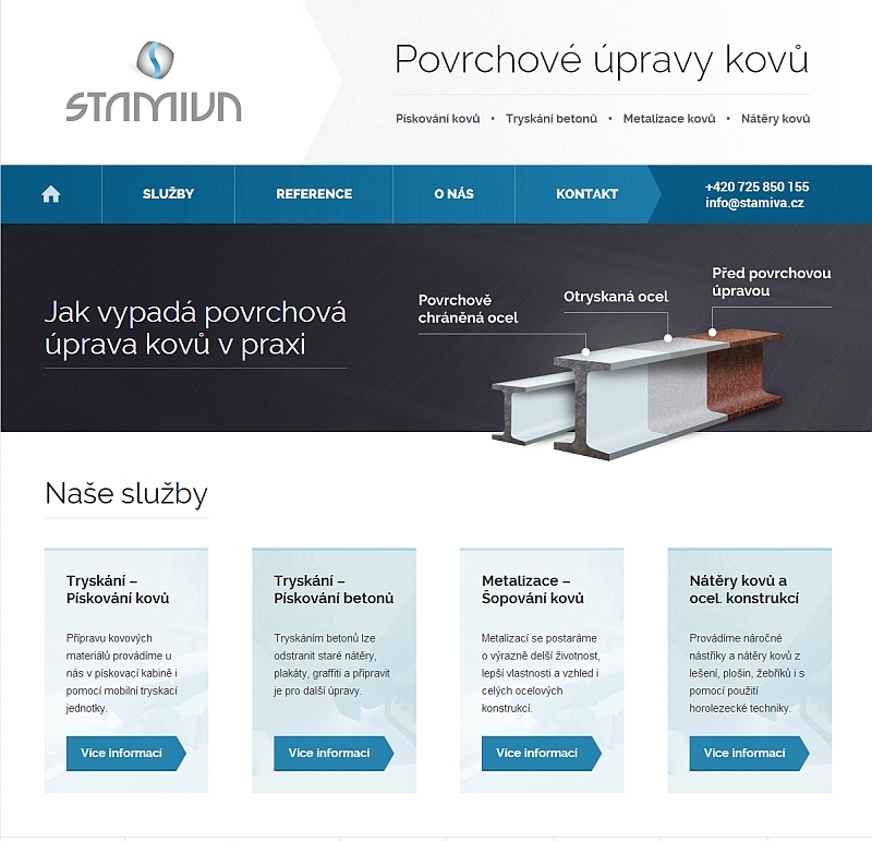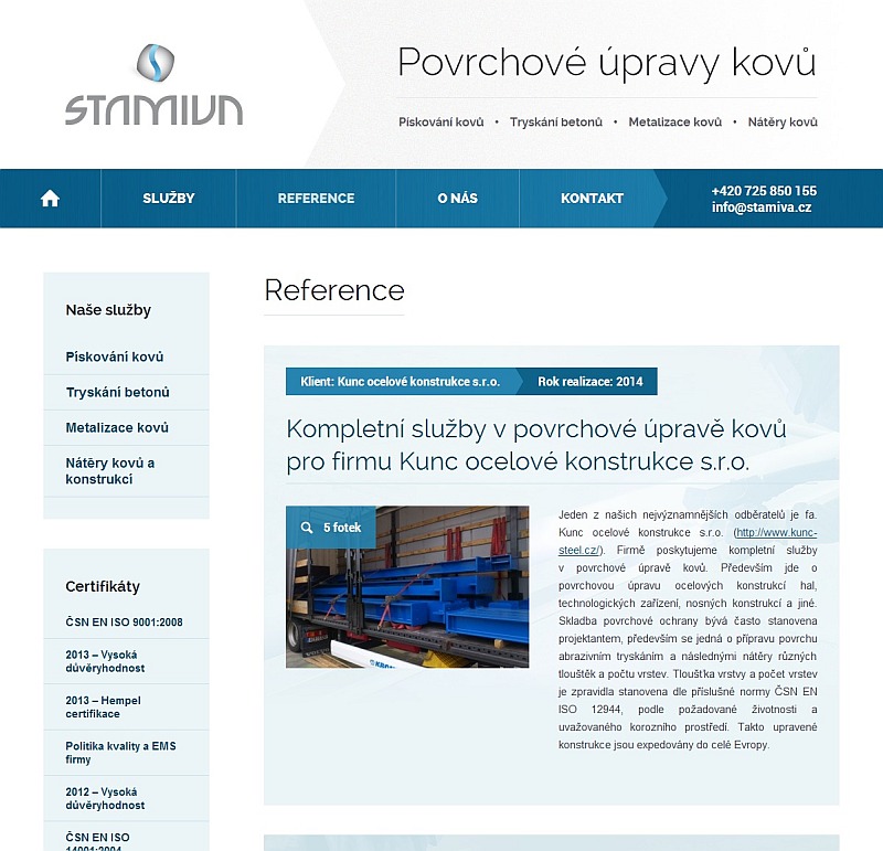 Spustili jsme stránky společnosti Stamiva spol. s.r.o, která se zabývá úpravami povrchů, konkrétně tryskáním betonů a pískováním kovových povrchů. Pro tuto společnost jsme provedli přestavbu stránek, rozšířili jsme její obsah o významné reference a na správu obsahu jsme použili redakční systém Wordpress tak, aby správa jejich obsahu byla co nejefektivnější a nejintuitivnější. Tyto stránky naleznete na adrese www.stamiva.cz.